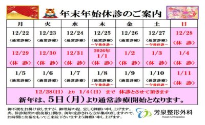 年末年始休診の御案内 令和7年12月28日(日)~令和8年1月4日(日)まで 休診とさせていただきます。 新年は、5日(月)よりの通常診療とさせていただきます。 御不便をお掛け…