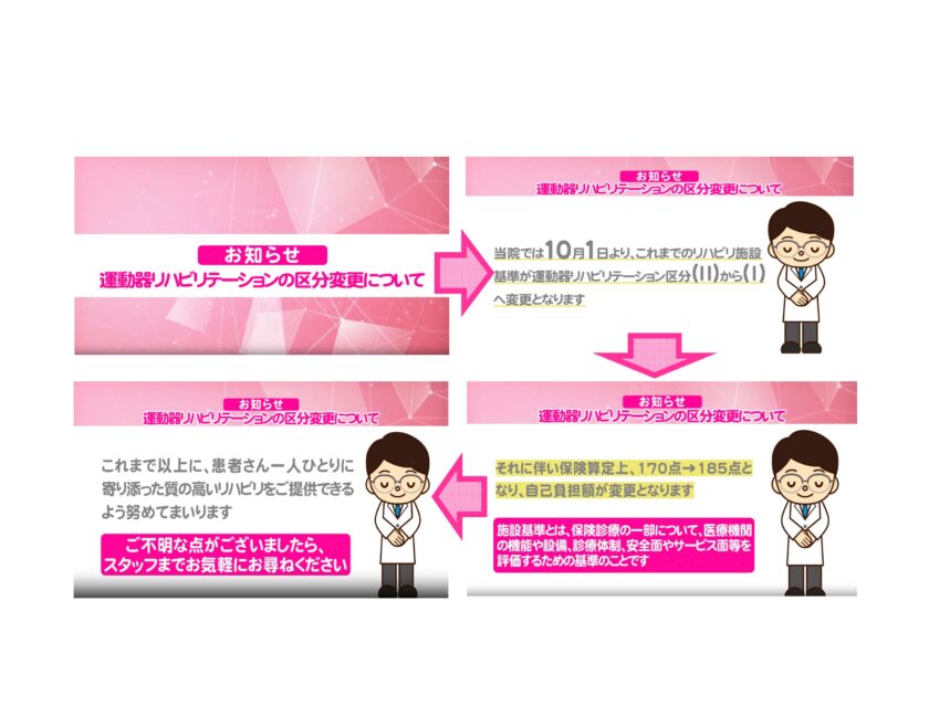 10月より これまでのリハビリ施設基準が運動器リハビリテーション(Ⅱ)から 運動器リハビリテーション(Ⅰ)に変更となっております。 それに伴いまして1単位20分当り170点から185点となり 自己負担額が変更となります。 これまで以上に患者様に寄り添った 【質の高いリハビリ】を御提供できるよう 努めてまいります。御理解の程何卒宜しく御願い申し上げます。