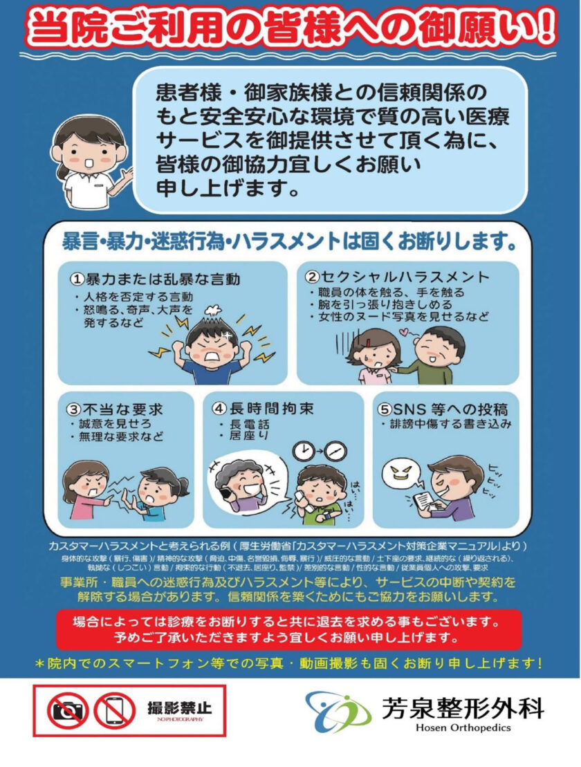 【暴言・暴力・迷惑行為】また【それに該当する行為】が 認められた場合、診療をお断りし、退去いただく場合がございます。